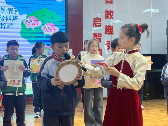 除了热闹的元旦活动,本次活动更是第二届校园数学节的圆满闭幕式。现场特别设置了成果展示环节,将数学节的精彩瞬间一一定格。在为期一个月的数学节里,全校师生热情参与、积极创作,用智慧与巧手打造出一件件佳作:刻度清晰的创意钟表、充满巧思的数学主题画、内容丰富的趣味手抄报。优秀作品的小主人们,带着自己的得意之作逐一登台,向全场展示这份独属于数学的魅力。