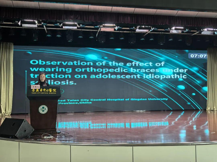 下半场会议中,泰安市中心医院团队集体展示了SOSORT会议发言英文展示(克罗地亚)。姜雯君、王晓玉、吴志平、丛文娟、罗丁元、吴菁围绕脊柱侧弯病因学、治疗学、脊柱侧弯精准评估、青少年特发性脊柱侧凸康复干预、支具制作、牵引治疗等前沿方向,连续完成7场高水平英文口头报告。