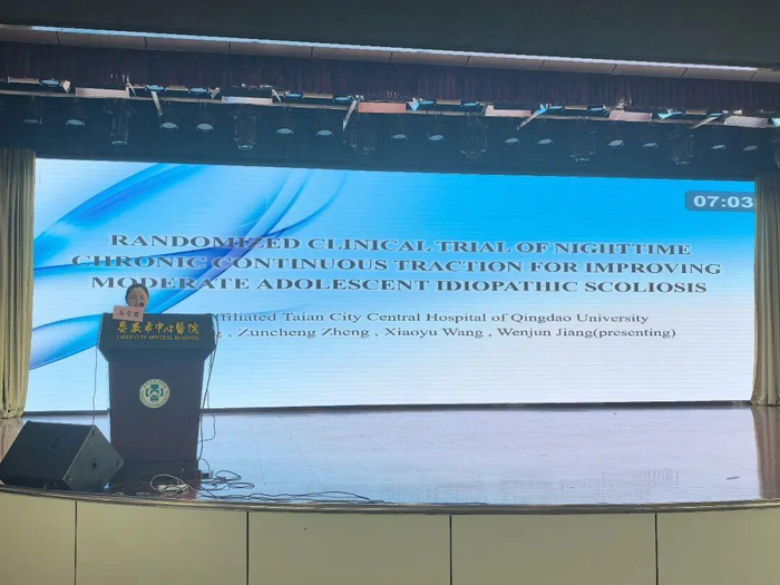 姜雯君汇报题目为《Randomized clinical trial of nighttime chronic continuous traction for improving moderate adolescent idiopathic scoliosis》(夜间慢性持续牵引改善青少年中度特发性脊柱侧凸的随机临床试验)