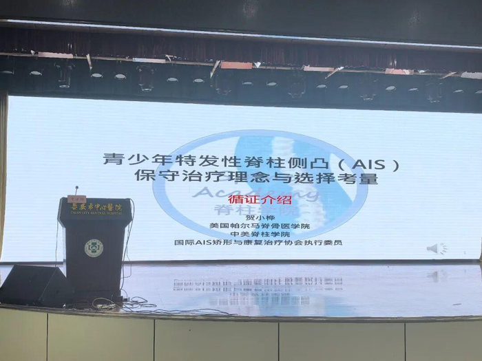 美国帕尔马脊骨医学院,国际AIS矫形与康复治疗协会(sosort)执行委员贺小桦教授通过线上方式分享了《青少年特发性脊柱侧凸(AIS)保守治疗理念与选择考量》。他结合国际前沿进展,系统梳理了青少年特发性脊柱侧凸的保守治疗新理念,强调了早期筛查和个体化康复的重要性。