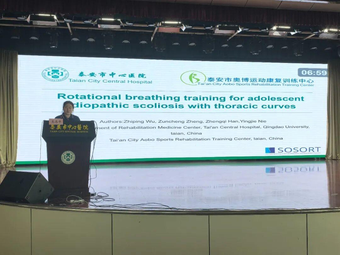 吴志平汇报题目为《Rotary breathing training for adolescent idiopathic scoliosis with thoracic curves》(青少年特发性脊柱侧凸伴胸部弯曲的旋转呼吸训练)。