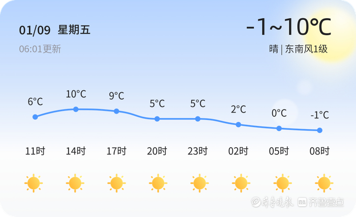 今天是2026年1月9日,农历十一月廿一,星期五。枣庄市天气晴朗,气温在-1℃至10℃之间,东南风1级,空气湿度为74%。空气质量方面,PM2.5指数为84,属于良好水平,适合户外活动。市民出行时建议注意保暖,早晚温差较大,适时增减衣物。今天的天气适宜出行,但需注意防风保暖。
