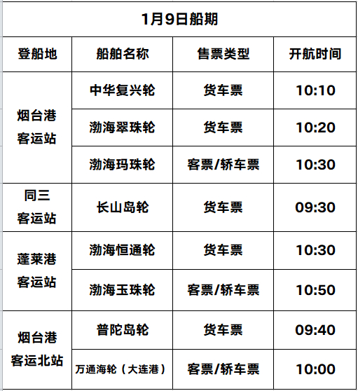 从山东港口烟台港获悉,受气象影响,预计1月9日15:00后烟台一大连航班停航,16:00后蓬莱一旅顺航班停航,1月9日暂定航班变更如下,请旅客朋友合理安排出行时间。实际班期会根据气象情况进行调整,具体开航时间以海事放行时间为准,咨询电话0535-6506666。