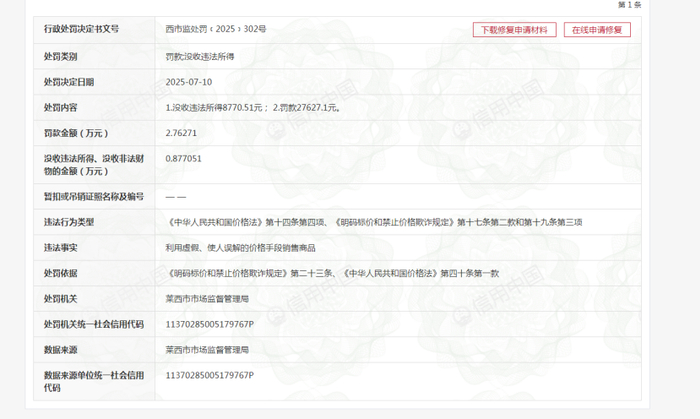 2025年7月10日,莱西市市场监管局对朵拉朵尚电商作出行政处罚(西市监处罚〔2025〕302号):没收违法所得8770.51元,罚款27627.1元。