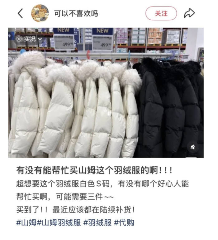 随着羽绒服的抢购热度,社交媒体上也很快涌现出大量“蹲守山姆羽绒服补货”“求胖东来羽绒服代购”的帖子。