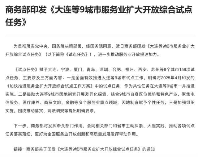 2025年4月,国务院印发《关于〈加快推进服务业扩大开放综合试点工作方案〉的批复》,明确在已有的北京等11个试点地区基础上,将大连等9个城市纳入试点范围。