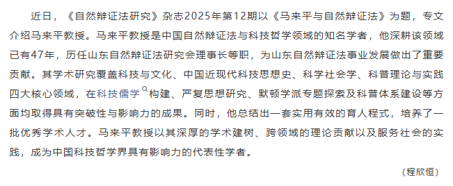 马来平作为中国自然辩证法研究领域的知名学者和山东省自然辩证法界的主要学术带头人,对山东省自然辩证法学科建设、人才培养和学术交流做出了突出贡献。他淡泊明志,潜心治学,在自然辩证法几大专业方向均有建树;同时,他又能走出书斋,服务社会,对地方的科技文化事业建言献策,真正践行了一位知识分子的社会责任,多次受到当地政府的表彰。