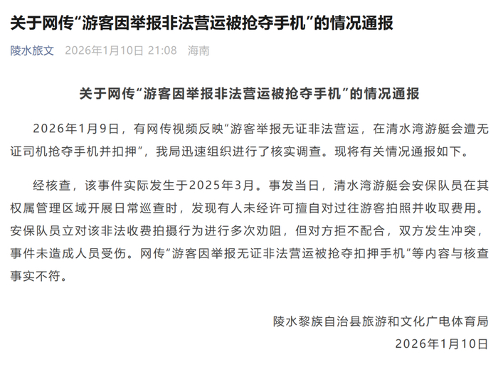1月10日,海南省陵水黎族自治县旅游和文化广电体育局发布关于网传“游客因举报非法营运被抢夺手机”的情况通报: