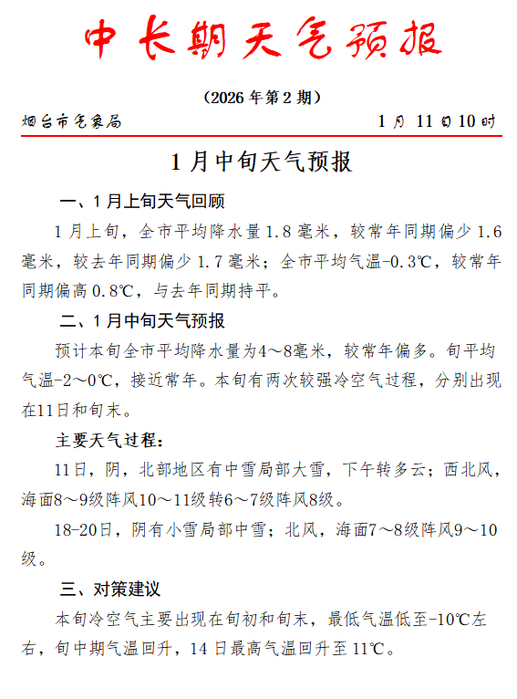 从烟台市气象局获悉,1月11日10时,该局总结回顾了1月上旬天气情况,同时发布1月中旬天气预报。预计本旬全市平均降水量较常年偏多,旬平均气温接近常年,有两次较强冷空气过程,分别出现在11日和旬末。