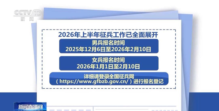 据了解,2026年上半年征兵工作已全面展开,上半年男兵报名时间为2025年12月6日至2026年2月10日,女兵报名时间为2026年1月1日至2月10日,详细请登录全国征兵网进行报名登记。