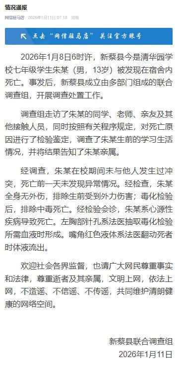 1月11日,河南新蔡县联合调查组发布情况通报,2026年1月8日6时许,新蔡县今是清华园学校七年级学生朱某(男,13岁)被发现在宿舍内死亡。事发后,新蔡县成立由多部门组成的联合调查组,开展调查处置工作。