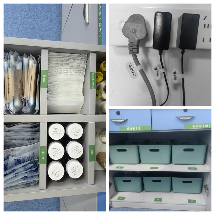 护理部则将标签管理融入日常,用细节优化为临床提速。护士站抽屉贴有清晰标识,“登记本、告知单” 等物品按类归位,告别杂乱。治疗室无菌区以绿色标签标注储物格用途,“棉签、输液贴、安尔碘” 等物资分区摆放,护士无需翻找即可精准取用,实现 “忙而不乱”。就连护士站电源线上也贴有专属标签,“打印机、呼叫器、路由器” 一一对应,设备故障时能迅速定位电源,大幅缩短应急处置时间。