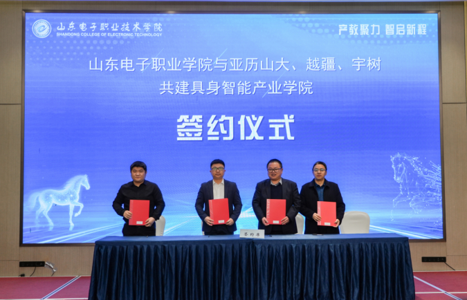 在产教融合签约仪式环节,推进三项合作重磅落地:一是启动工业和信息化部人才交流中心《具身智能岗位能力图谱与人才培养参考指南(高等职业学校)》编制工作;二是山东电子职业技术学院与宇树科技、深圳越疆、亚历山大智能等企业签约共建具身智能产业学院,深化校企协同育人;三是山东电子职业技术学院与北京紫光集成电路科技有限公司签署“山电1号”芯片合作开发协议,助力产学研协同创新。
