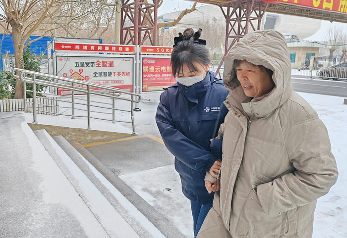 济南路营业厅刚开门,就迎来一位八旬老人前来办理补卡业务。营业员赵青耐心细致地为老人办理业务,并告知老人公司提供上门服务,今后有业务需求只需致电,在家等候即可。业务办理完毕后,赵青搀扶着老人走到营业厅门口。看到室外下着雪,路面湿滑,担心老人独自回家不安全,她当即叫了出租车,扶老人上车、付好车费,并叮嘱司机:“师傅,麻烦您慢点开,把老人安全送到小区门口。”老人紧紧拉着她的手,连声称赞:“你真是个好孩子,联通服务太贴心了!”