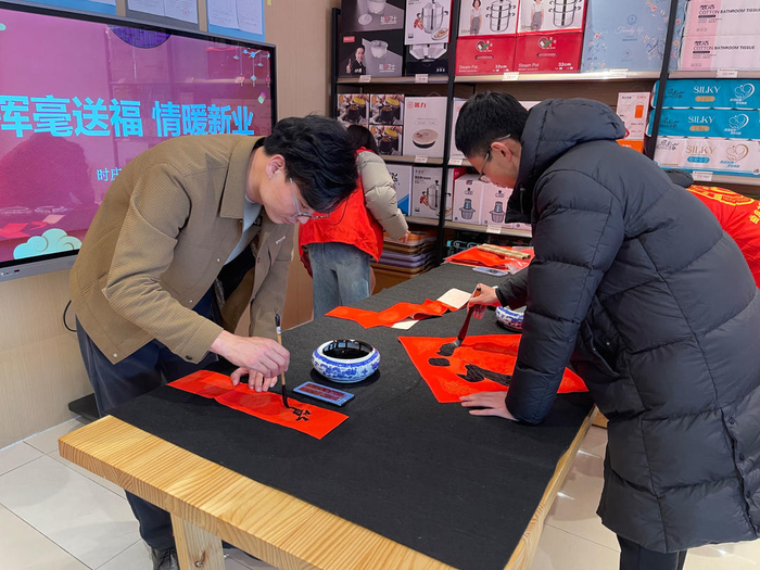 活动现场,社区工作人员提前备好笔墨纸砚,邀请曲阜市书法家协会老师与大学生志愿者们一同挥毫泼墨。一幅幅寓意吉祥的春联、一个个饱含祝福的“福”字跃然纸上,既寄托着对新春佳节的美好憧憬,更承载着社区对新就业群体的诚挚关怀与亲切问候,现场墨香四溢、暖意涌动。