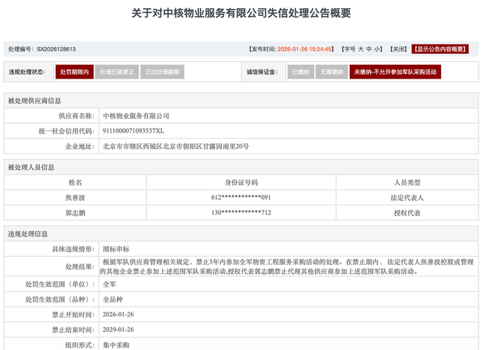 《关于对中核物业服务有限公司失信处理公告》(处理编号:SX2026128613)显示,经调查核实,中核物业服务有限公司在参加项目编号2025-JW38-F1049的采购活动中,存在围标串标等违规行为。根据军队供应商管理相关规定,自2026年01月26日起算3年禁止中核物业服务有限公司全军物资工程服务采购活动的处罚。