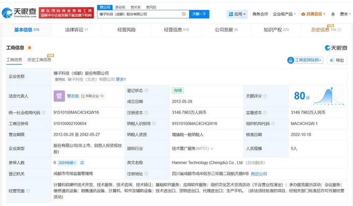 锤子科技(成都)股份有限公司成立于2012年5月,注册资本约3149.8万人民币,经营范围包括基础软件服务、应用软件服务、组织文化艺术交流活动等。股东信息显示,该公司由罗永浩、成都东方广益投资有限公司、北京明匠汇智投资管理合伙企业(有限合伙)等共同持股。任职信息显示,罗永浩在该公司担任董事长并持股约23%。