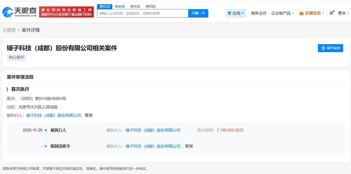 天眼查天眼风险信息显示,近日,锤子科技(成都)股份有限公司及其法定代表人管志良新增一则限制消费令,执行法院为北京市大兴区人民法院。案件流程信息显示,去年11月,该公司已因此案被执行714万余元。