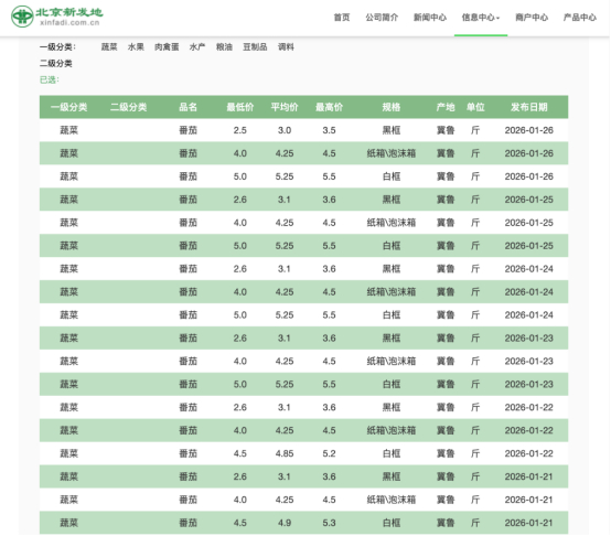 近期北京新发地西红柿批发价(来源:新发地官网)北京新发地市场监测数据显示,1月21日至26日,市场西红柿价格走势分化,其中纸箱/泡沫箱最低价、最高价、平均价分别为4.0元/斤、4.5元/斤、4.25元/斤,价格未变;黑框西红柿最低价、最高价和平均价呈现下降趋势,分别从2.6元/斤、3.6元/斤、3.1元/斤降至2.5元/斤、3.5元/斤、3.0元/斤。