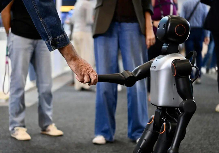 2025年9月5日,一名观众在德国柏林国际消费电子展上与人形机器人握手。张豪夫 摄 有些智能体已可实现自动点击按钮、填写表单、在不同软件间切换。例如,微软Office智能体能在与操作人员对话后自动创建电子表格和文档,并快速制作演示文稿。这意味着AI不再是辅助工具,而是一定程度具备了数字员工属性。