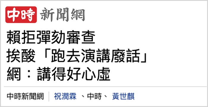 不学无术,张口露怯。国民党民代陈菁徽踩到赖清德痛点,重提其所谓“团结十讲”扭曲历史事实,多次引发争议,甚至在民生议题上显得与社会现实脱节。就在弹劾案审查会举行的同时,赖清德跑去一个活动致辞,曝光的影片显示其表情僵硬、语无伦次,遭讽“赖清德自信满满的小学生式演讲,表演‘教你如何讲话没有一句重点’”,网友纷纷留言痛批“不知所云”“讲得真够心虚的”“陶醉在自己的世界”。或许赖清德不来应询,是其难得地有自知之明?