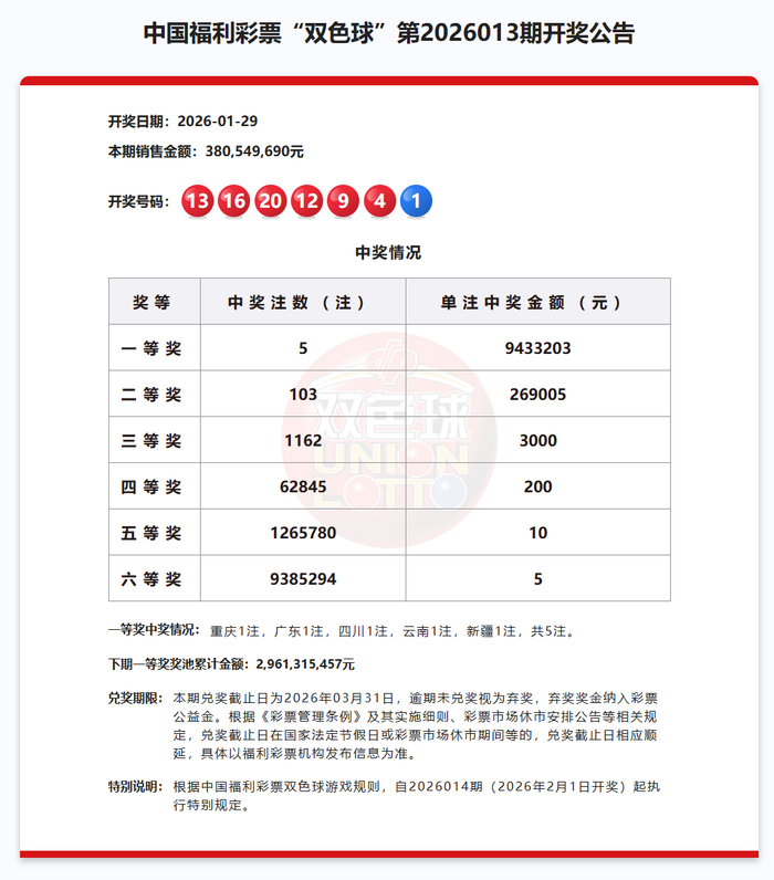 特别说明:根据中国福利彩票双色球游戏规则,自2026014期(2026年2月1日开奖)起执行特别规定。