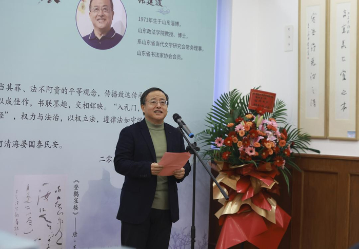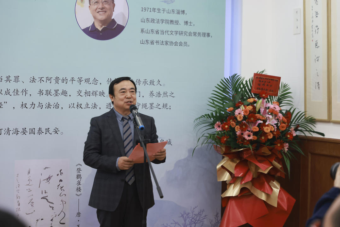 张建波教授致辞表示,齐鲁大地文脉昌盛,法治底蕴深厚,此次齐鲁法治楹联展是济南市市校融合发展战略工程项目《齐鲁法治文化产教研创基地》的阶段性成果展示,能与书法名家薛伟东先生联袂办展,实属荣幸。他将“以礼为范、以德为美、以权为规、以廉为鉴”的理念融入齐鲁法治楹联创作,以“礼法篇”“德法篇”“权法篇”“廉法篇”为名,创作了十六副齐鲁法治楹联,以法治人物阐释法治之理,以法治故事讲述廉洁之风,以齐鲁名胜揭示从政之道。薛伟东先生“挥毫落纸如云烟,笔墨传情寄法魂”,将楹联中的法治哲思转化为书法艺术的视觉表达,为大家呈现了一场书法艺术的精彩盛宴。最后他对省图尼山书院领导和到场嘉宾致谢,正是大家对传统文化的尊崇、对法治传播的热忱,才让这场“书联墨趣德润法,纸上清风俭养廉”的文化盛宴得以呈现。