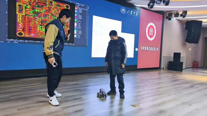 紧接着,王天烨向台下发放芯片实物供大家观摩,结合智能避障车、PCB板等自制作品,直观展示了集成电路的应用场景。