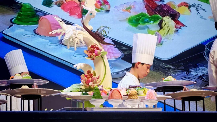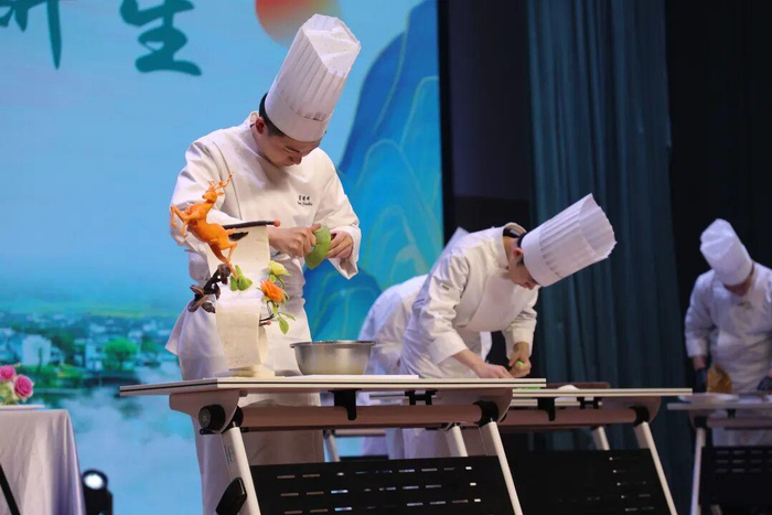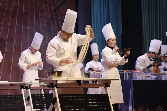 活动最后,中餐烹饪与中西面点专业优秀毕业生代表与在校学生联袂呈现技能展演《烹燃创艺,食韵新生》。他们以娴熟的技法、创新的构思,现场制作出多道兼具传统韵味与现代审美的菜品与面点,将全场气氛推向高潮,生动展现了齐鲁饮食文化的传承活力与时代新韵。
