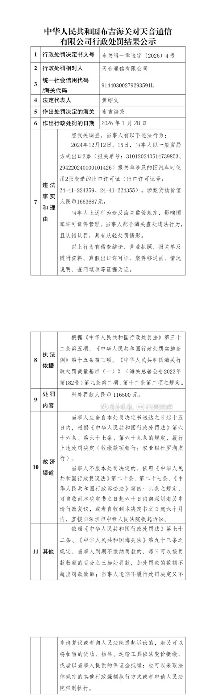 天音通信有限公司因违反海关监管规定,被罚款116500元。
