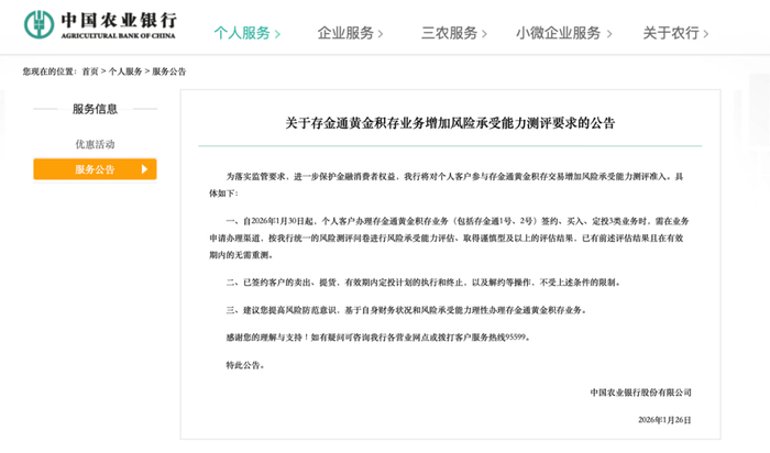 1月26日,农业银行发布公告称,自1月30日起,个人客户办理存金通黄金积存业务(包括存金通1号、2号)签约、买入、定投3类业务时,需在业务申请办理渠道,按该行统一的风险测评问卷进行风险承受能力评估、取得谨慎型及以上的评估结果。