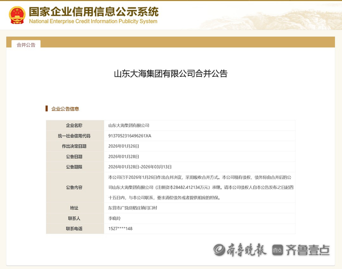 近日,齐鲁晚报·齐鲁壹点记者从国家企业信用信息公示系统获悉,山东大海集团有限公司(简称“山东大海集团”)发布合并公告:本公司已于2026年1月26日作出合并决议,采用吸收合并方式。本公司现有债权、债务将由合并后的公司山东大海集团有限公司(注册资本28482.412134万元)承继。请本公司债权人自本公告发布之日起四十五日内,与本公司联系,要求清偿债务或者提供相应的担保。