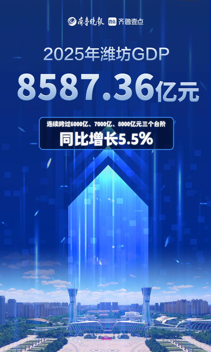2月3日,潍坊市统计局发布2025年潍坊市经济运行情况。根据市级生产总值统一核算结果,2025年全年全市生产总值为8587.36亿元,按不变价格计算,同比增长5.5%。其中,第一产业增加值725.73亿元,同比增长4.0%;第二产业增加值3539.67亿元,增长4.6%;第三产业增加值4321.96亿元,增长6.5%。