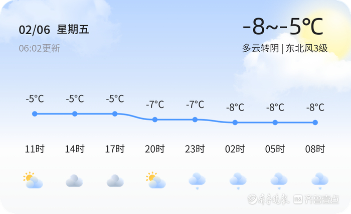 今日是2月6日(农历十二月十九),东营市迎来寒潮天气。今日天气为多云转阴,气温在-5℃至-8℃之间,东北风3级,空气湿度为56%。PM2.5指数为44,空气质量为良好。由于寒潮影响,气温骤降,市民出行请注意保暖,建议佩戴口罩、手套等防护用品,防止感冒。同时,由于风力较大,建议减少在户外长时间停留,尤其是老年人和儿童。