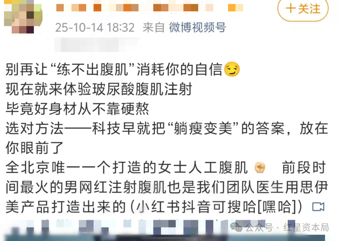 截图自某博主的视频红星资本局注意到,自此以后,社交平台上出现了更多类似的分享,还有医美机构晒出相关案例拉客——“别再让‘练不出腹肌’消耗你的自信,现在就来体验玻尿酸腹肌注射。”
