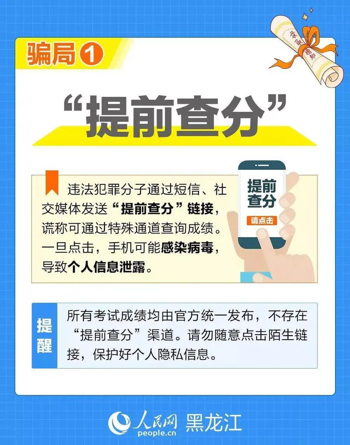 正确做法:通过省教育考试院官网、学校官方渠道查询信息,避免点击陌生链接、扫描陌生二维码。