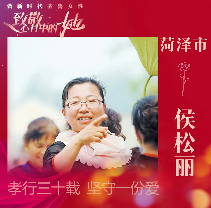 侯松丽,女,1971年2月生,中共党员,菏泽市单县园艺街道单庄社区居民。她三十余年如一日,悉心照料患有精神障碍的婆婆,并积极参与助老志愿服务活动,以实际行动践行孝老爱亲、热心助人的传统美德,获评“山东好人”等称号。
