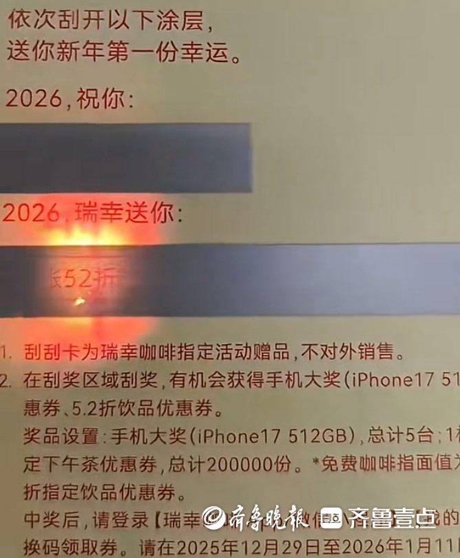 据该网友介绍,当日上午其通过瑞幸手机App在一家门店购买咖啡后,获赠一张刮刮卡。偶然间发现,在光线昏暗环境下,将手机手电筒紧贴刮刮卡背面照射,便能穿透涂层看清下方文字。据了解,本次奖品种类多样,最高奖项为iPhone 17 512GB,总计5台;1杯免费咖啡(面值为35元的饮品兑换券),共计100000份;9.9元制定下午茶优惠券,总计200000份;其他奖品为5.2折指定饮品优惠券。