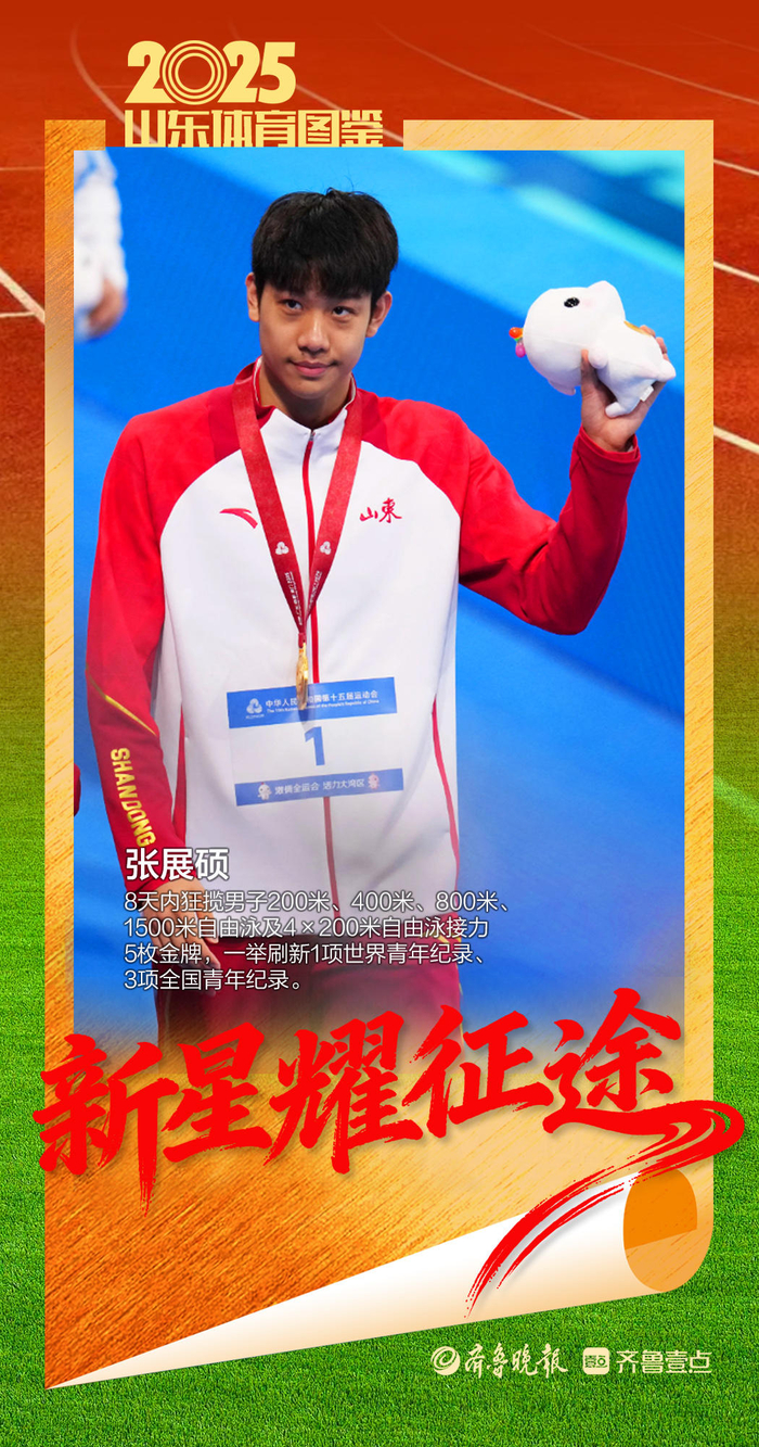 18岁的张展硕成为全运会最耀眼的新星之一,8天内狂揽男子200米、400米、800米、1500米自由泳及4×200米自由泳接力5枚金牌,一举刷新1项世界青年纪录、3项全国青年纪录。