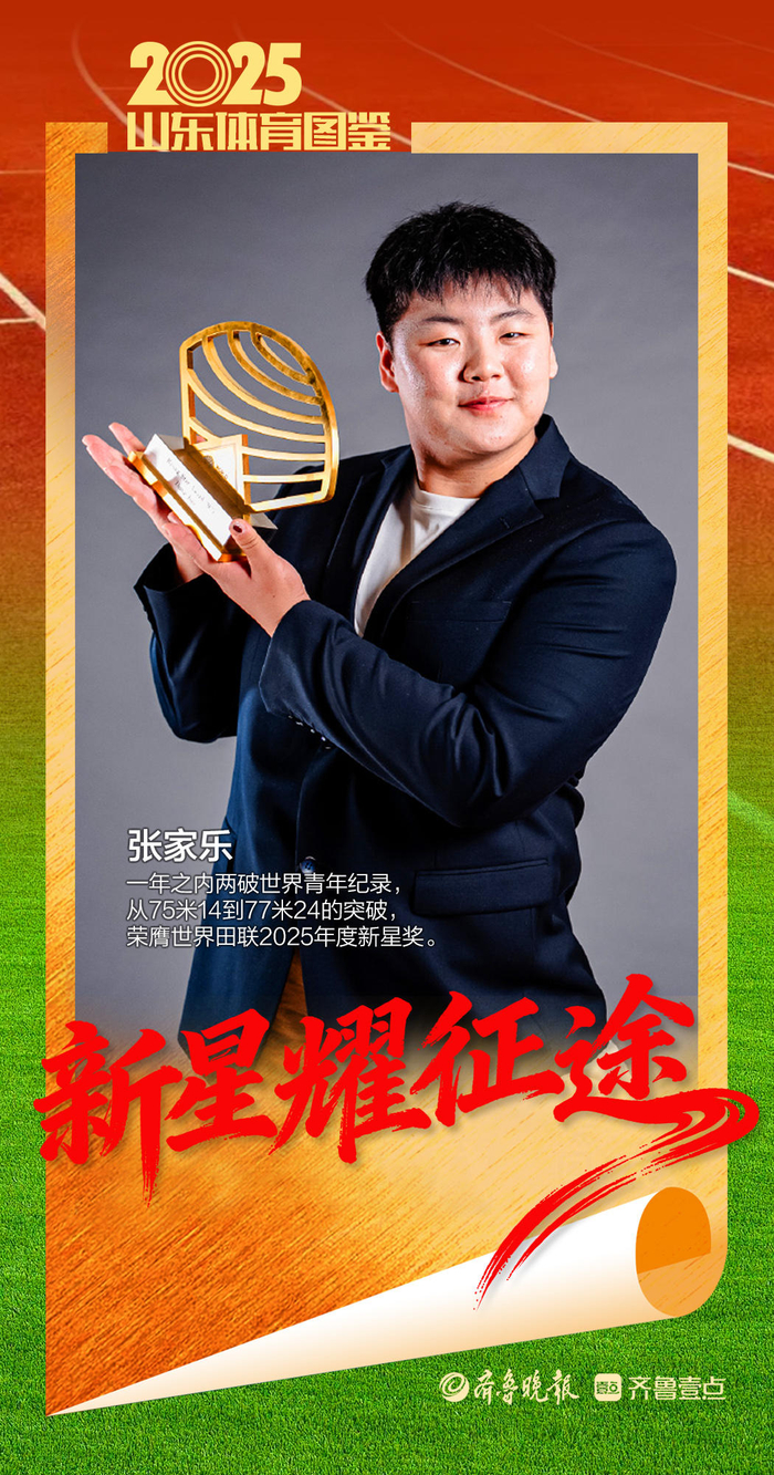 19岁的女子链球运动员张家乐则荣膺世界田联2025年度新星奖,一年之内两破世界青年纪录,从75米14到77米24的突破,彰显着她“为家乡、为祖国争荣誉”的坚定信念。