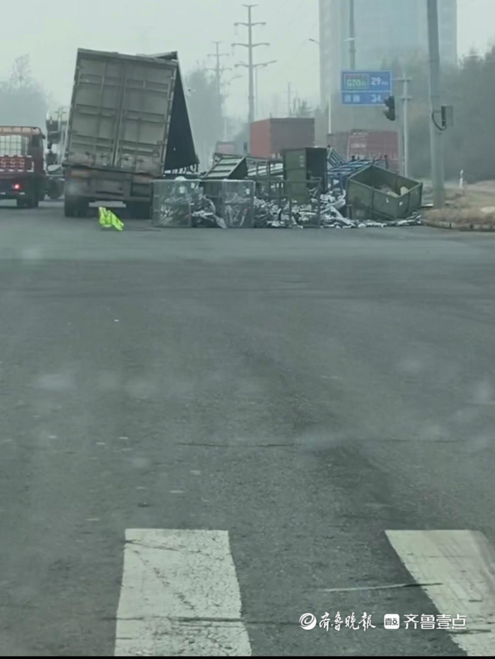 1月31日,济南情报员“chen”向齐鲁晚报官方客户端齐鲁壹点情报站报料称,今天下午两点十分左右,在潘王路与龙泉路十字路口,一辆货车的车厢开裂散架,大量货物撒了一地,所幸没有人员受伤。