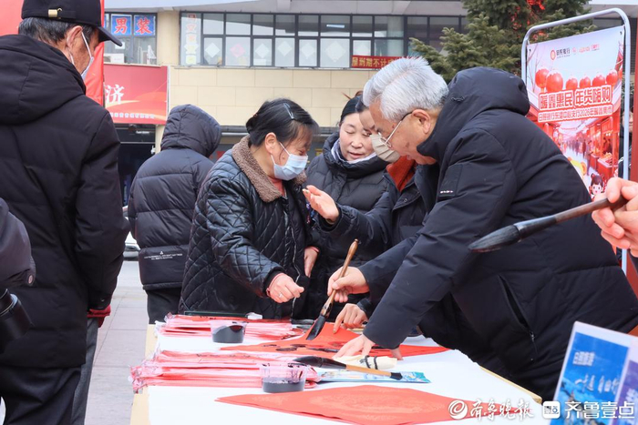 年货节现场亮点纷呈:书法家挥毫书写定制春联,手写墨香传递别样年味;社区文艺演出轮番上演,歌舞助兴氛围热烈;日照银行、文旅一卡通等展位提供便民服务与消费福利,实现“线下逛购+线上云购”双线联动。