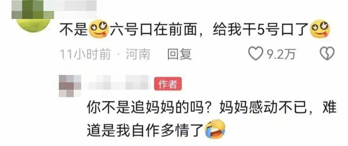 视频中的男生在评论区留言:“不是,6号口在前面,给我干5号口了。”妈妈则在这条评论下回复:“你不是追妈妈的吗?妈妈感动不已,难道是我自作多情了。”