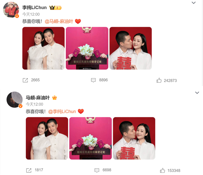 当你以为现实中的李纯也该是如此时,她却低调在微博公开婚讯,没有惊动媒体的求婚预热,简单发了和民谣歌手马頔的结婚登记照。