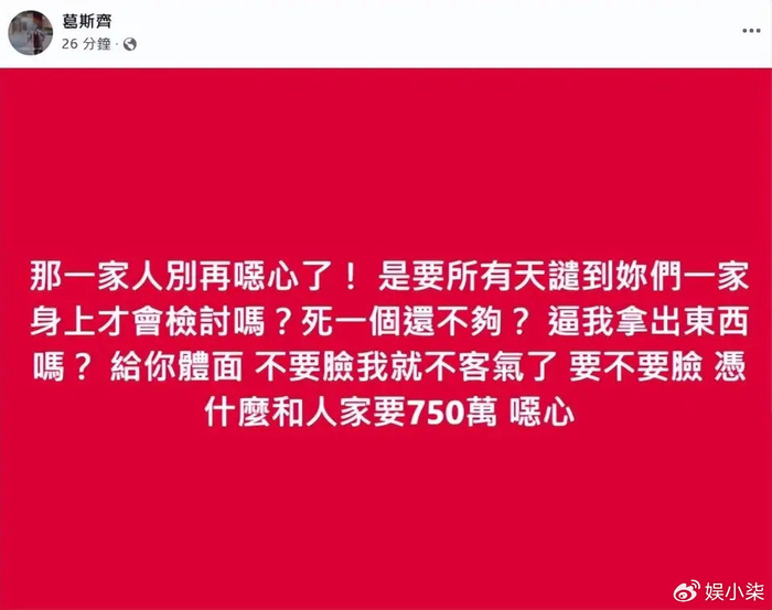 不过在爆料中,葛斯齐就大胆开麦,让S家在自己身上找问题,并爆料他们还向汪小菲索要750万,看起来还是因为财产和抚养权问题引发的风波,葛斯齐更表示自己手上还有别的证据,希望S家不要太不要脸面。