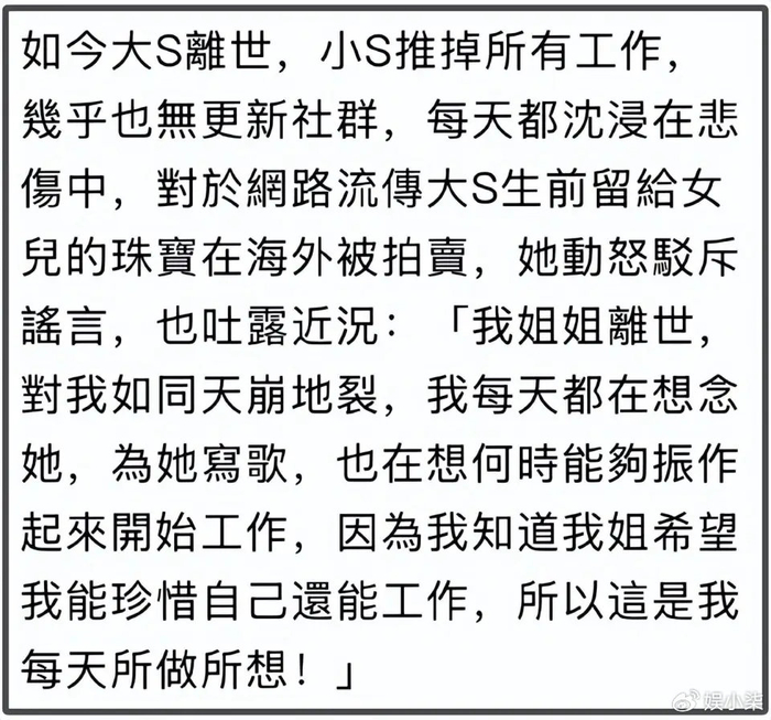 同样的,小S似乎也还没走出大S离世的阴霾,在离世后一直想要复工,但是一直都没有成功,因此面对外界猜测,小S也表示自己没空去理会姐姐的珠宝在海外被拍卖的问题,自己只想要带着姐姐的期待努力的开始工作。