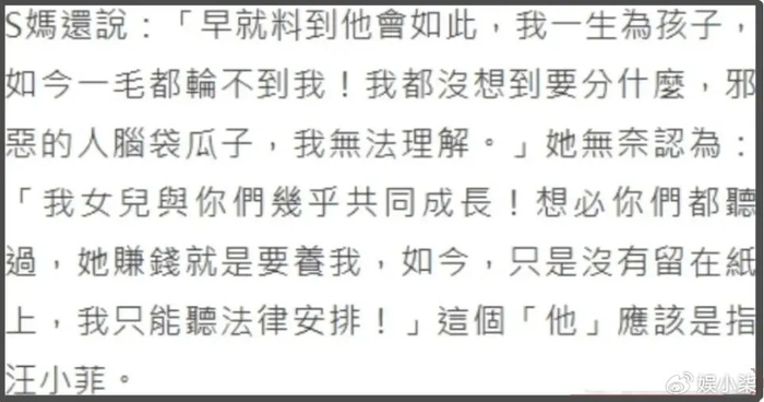 能感觉到S妈对于遗产的分配还是有些不满的,认为大S的钱本来就是养自己的,结果分给了两个跟自己没有血缘关系的男性,具俊晔也就算了,最起码人家现在看起来还跟S妈站在一条战线,而汪小菲凭借孩子分到更多的财产,让S妈心中不是滋味,毕竟这几年几人在网上就没少骂战。