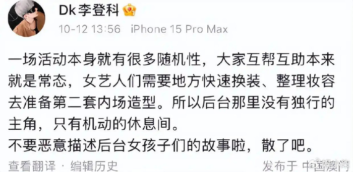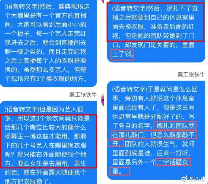 而且小八也更相信娜扎经纪人说的,毕竟一场盛典几十个艺人,就给安排三个更衣室,还是专属的,从合理性上也有些问题,毕竟明星到场和出场顺序不一样,更衣室一直空着对主办方来说也是一个浪费。所以我更相信是轮流使用的情况,之中出现些小摩擦应该也是正常,不会像爆料者说的那么夸张。
