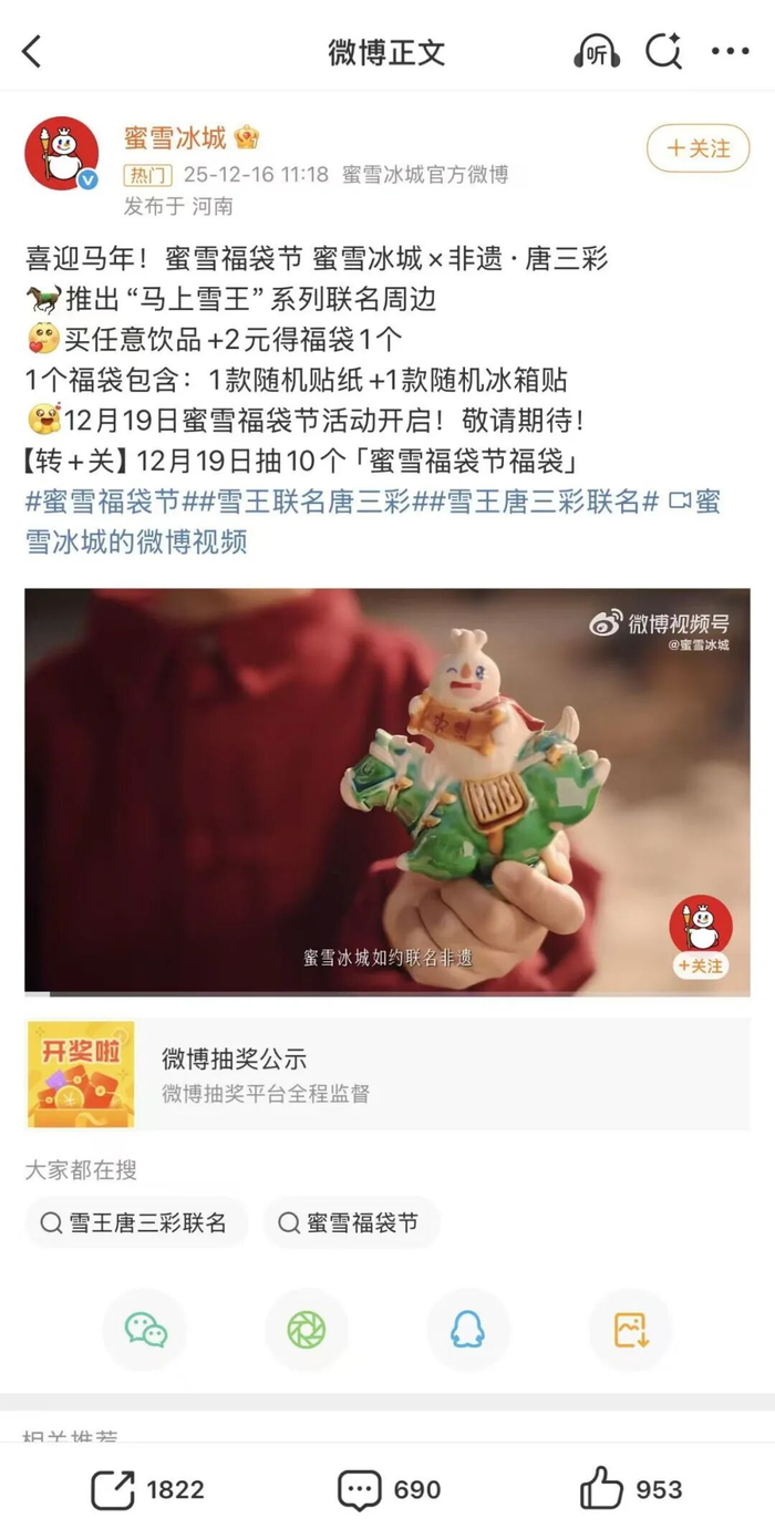 就拿近期蜜雪冰城联名国家级非遗唐三彩技艺,推出“马上雪王”文创产品来看。没有复杂的文化解读,仅以亲民的价格和萌趣的设计,就让古老的技艺变得可拥有、可分享,甚至引发了用户“必须买到”的强烈共鸣。网友那句“话我撂这了,这个冰箱贴要是买不到,就是雪王你背刺我!”,恰恰证明:当文化体验足够轻巧、有趣时,用户自会主动拥抱并为之代言。