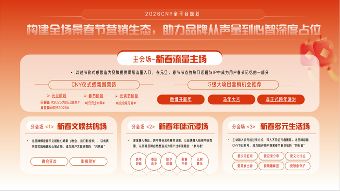 把这层层情绪拼在一起,一幅更真实、更丰富的春节图景便浮现出来。微博就像一个容纳百态的春节生活空间,无论是渴望陪伴的i人,还是热衷分享的e人;无论品牌想要传递温情,还是展现酷感,都能在这里找到自己的位置和表达方式——可以在充满年味的氛围里做用户的暖心旅伴,也能在多元的兴趣圈层中和年轻人玩到一块。